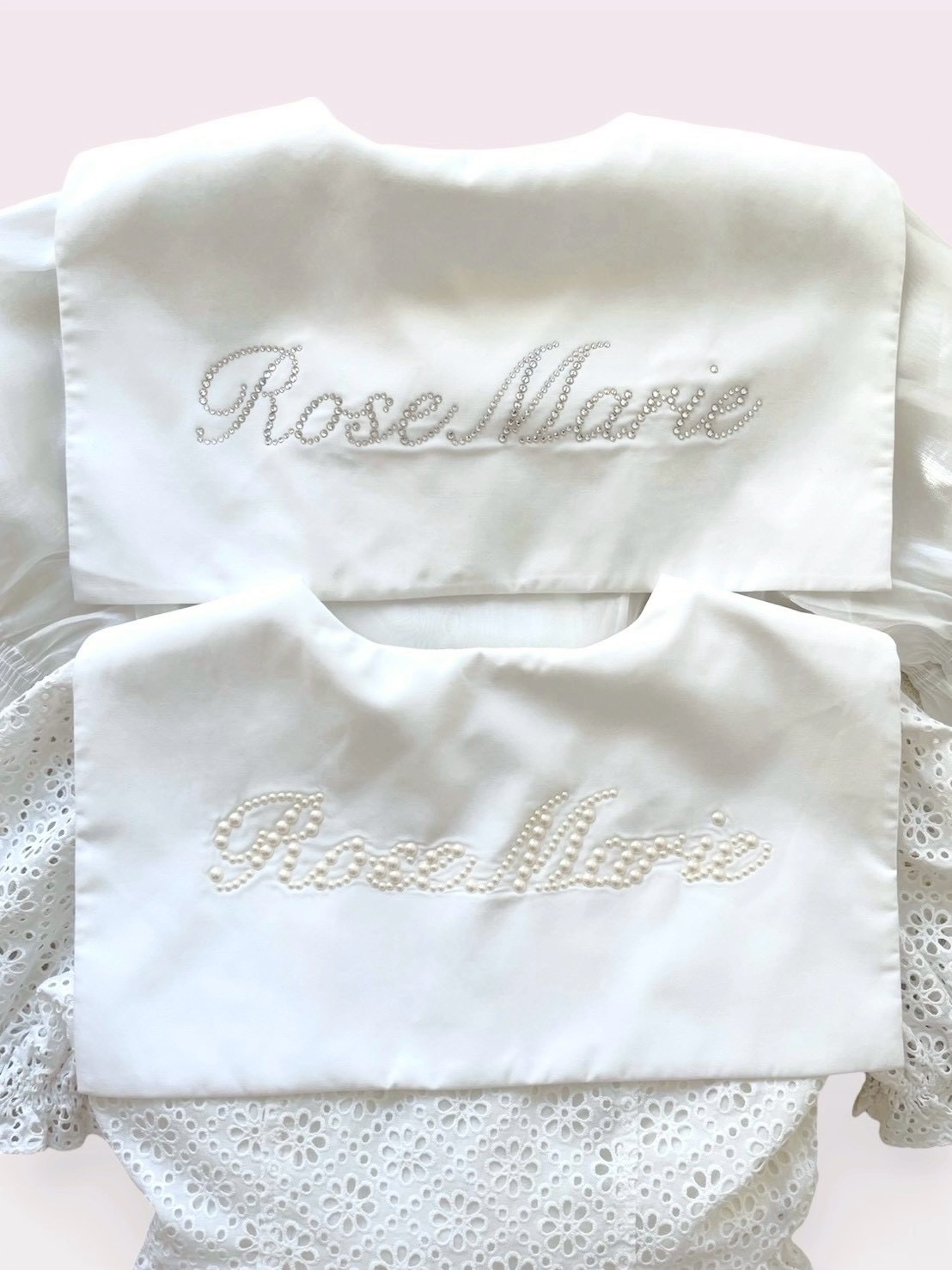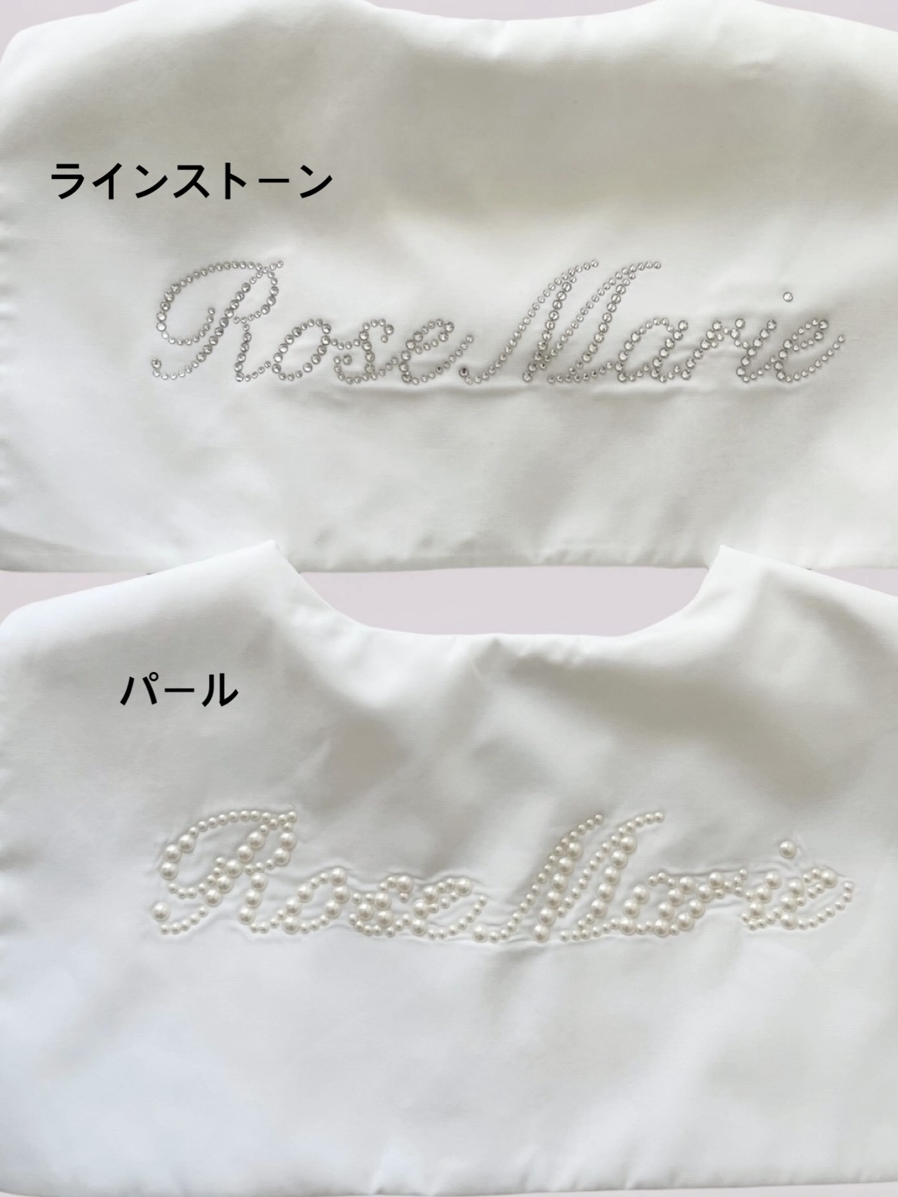 襟のロゴマークはパールとラインストーンからお選びいただけます。
